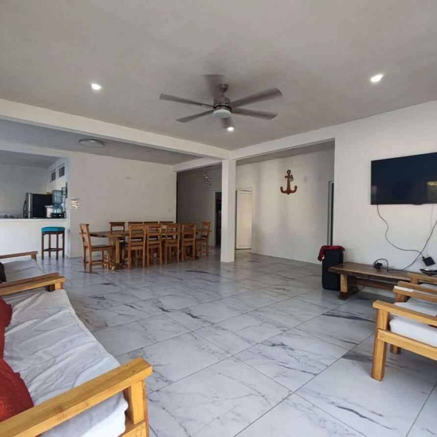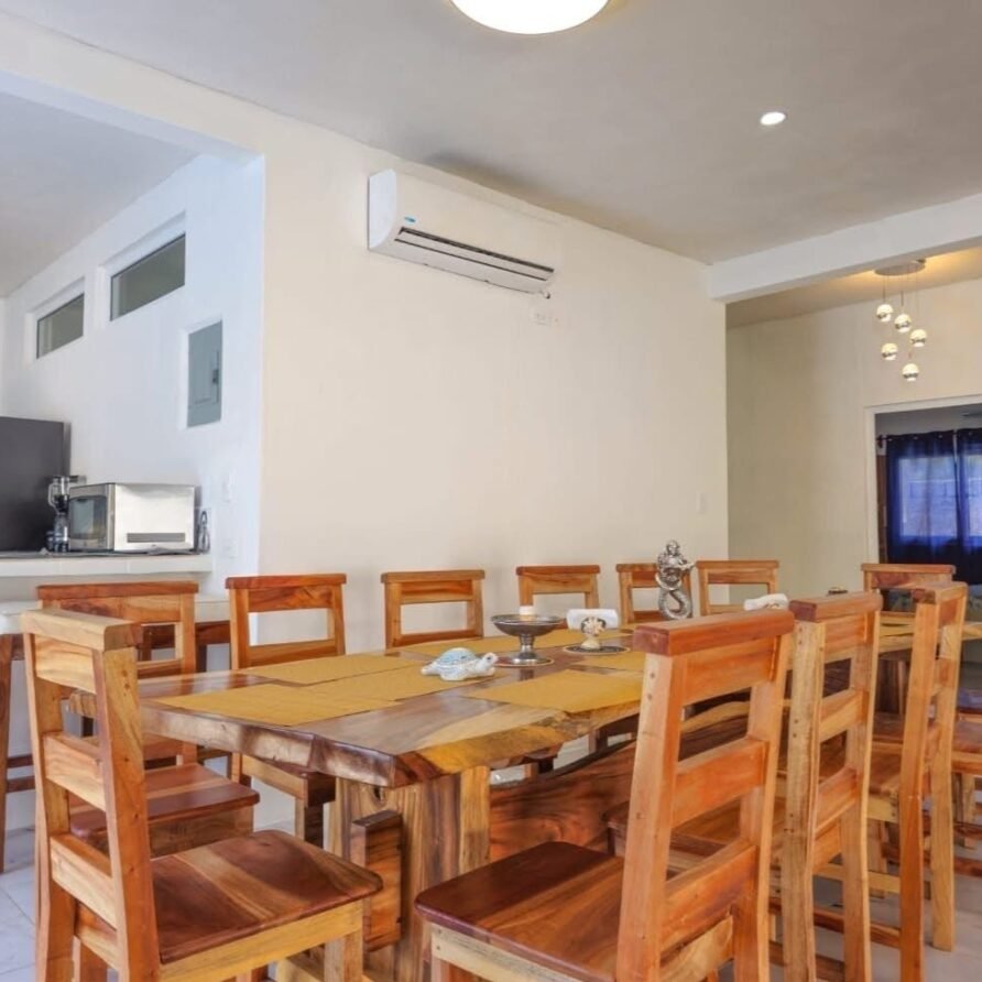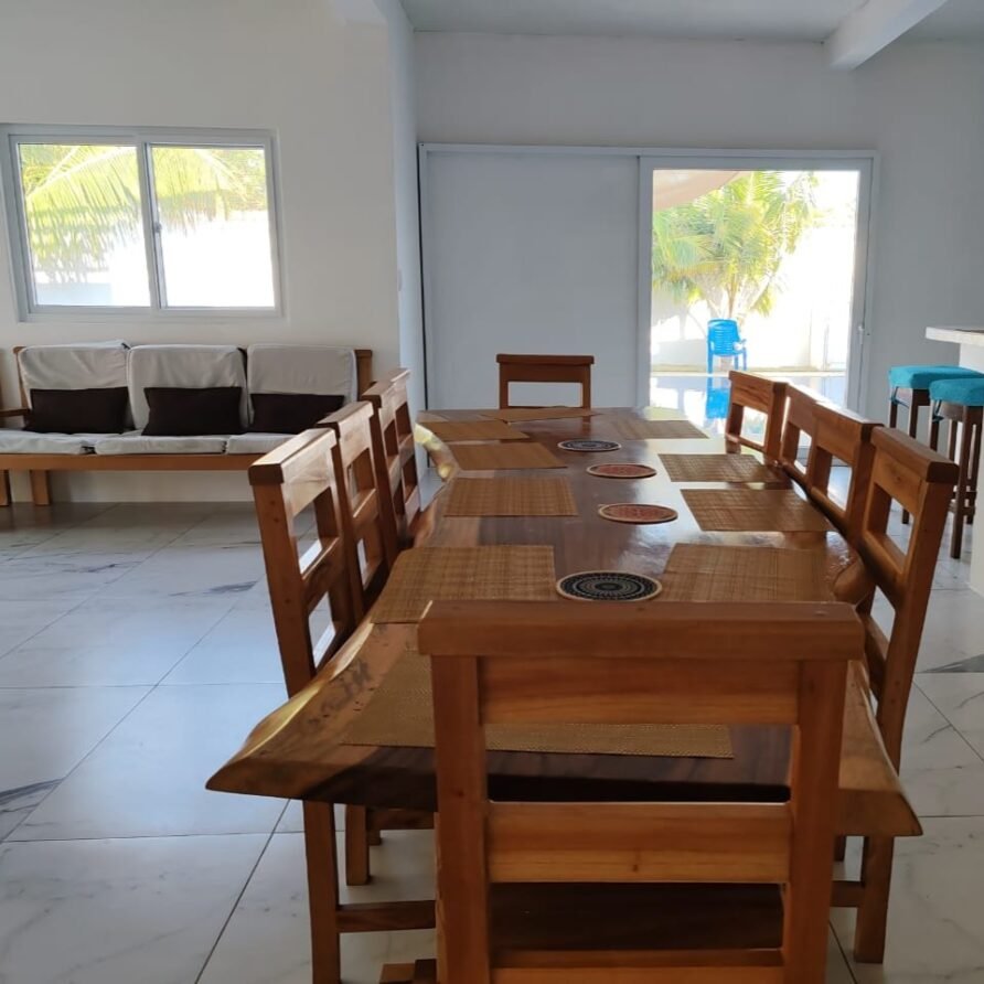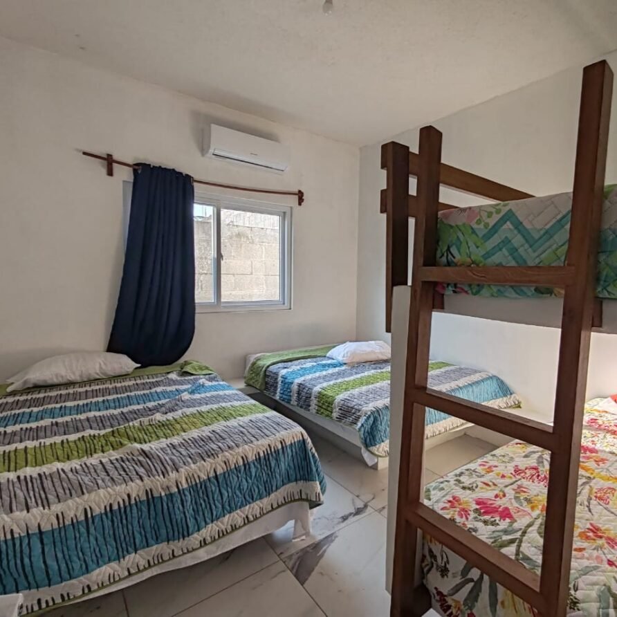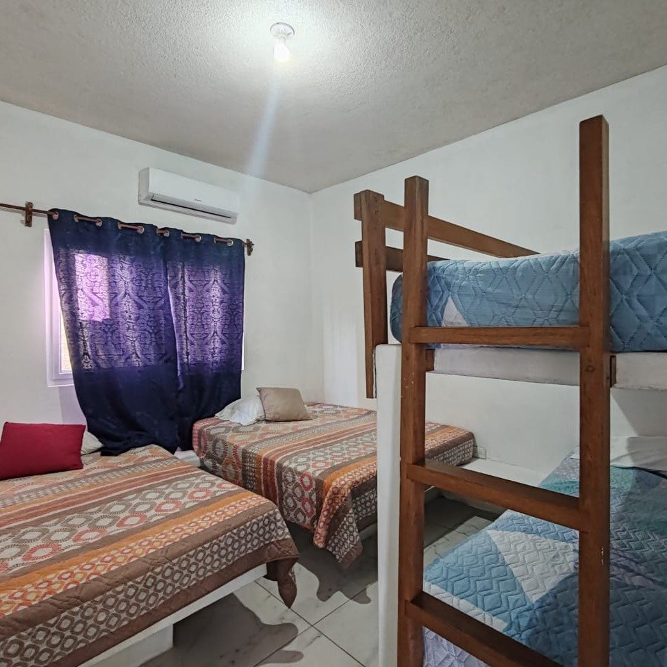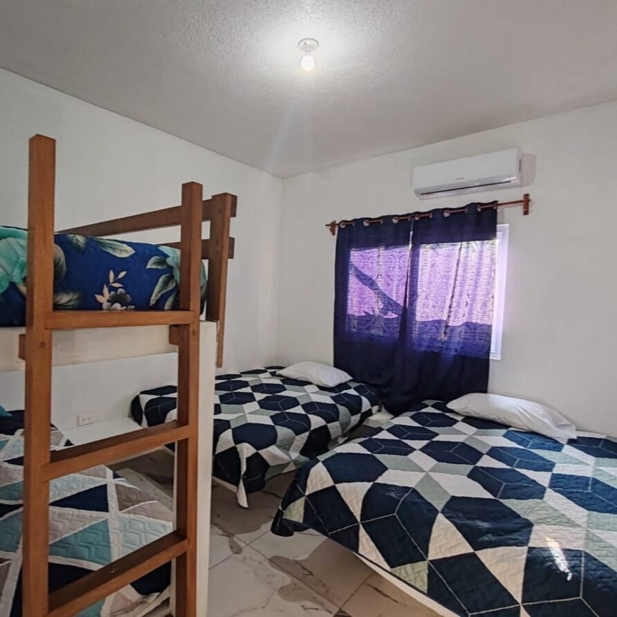 La propiedad cuenta con cuatro habitaciones con aire acondicionado, equipadas con ocho camas matrimoniales y seis camas en literas, además de tres baños completos, dos dentro de la casa y uno de servicio. Dispone de sala, comedor y cocina totalmente equipada, con aire acondicionado en la sala y cocina, brindando comodidad durante toda la estadía.